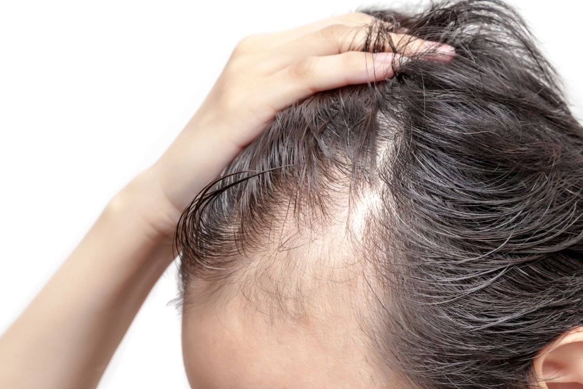 Popis obrázku: Řídnutí vlasů na temeni hlavy – androgenní alopecie u mužů. Zdroj: canva.com